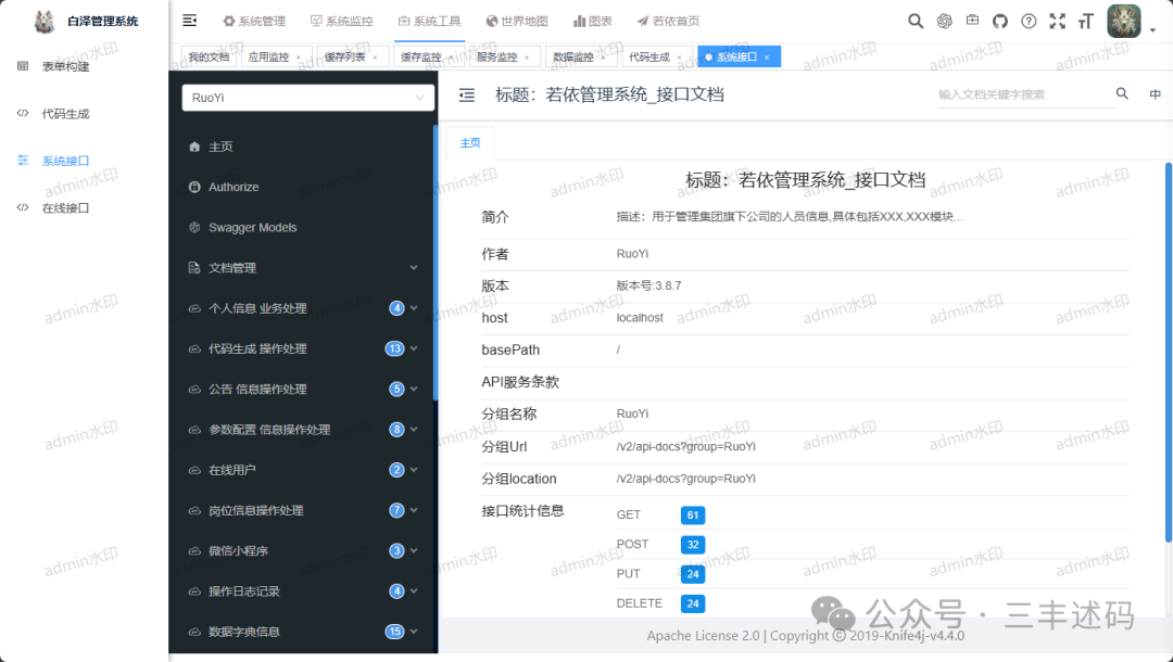 - 系统接口:根据业务代码自动生成相关的api接口文档。