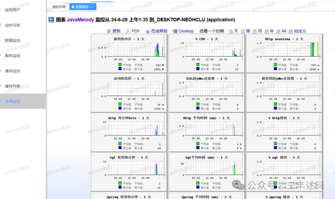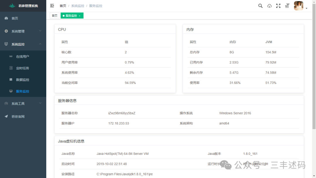 - 服务监控:监视当前系统CPU、内存、磁盘、堆栈等相关信息。