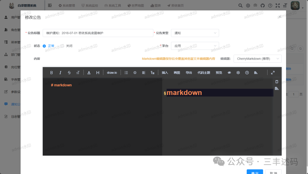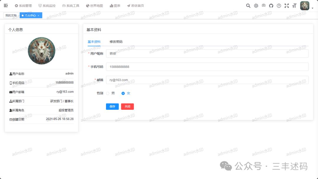 * 功能模块:Ruoyi框架内置了丰富的功能模块,包括用户管理、角色管理、权限管理、菜单管理、数据字典、定时任务、代码生成、文件上传、高德地图等,满足大多数企业级应用的基本需求。