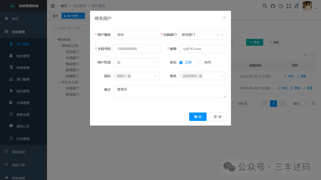- 部门管理:配置系统组织机构(公司、部门、小组),树结构展现支持数据权限。