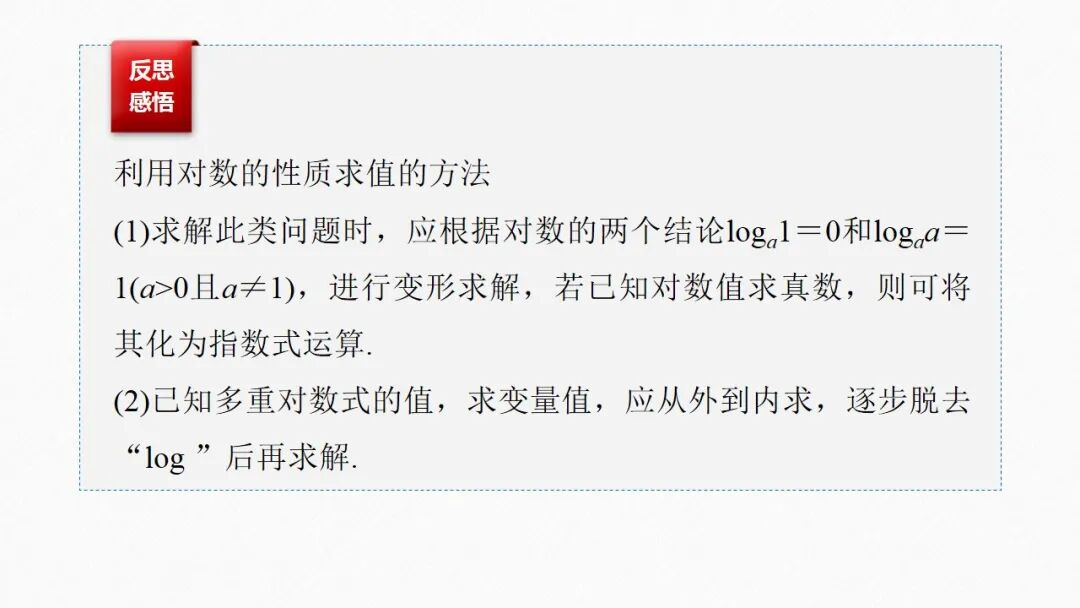 (1)求解此类问题时,应根据对数的两个结论loga1=0和logaa=1(a>0且a≠1),进行变形求解,若已知对数值求真数,则可将其化为指数式运算.