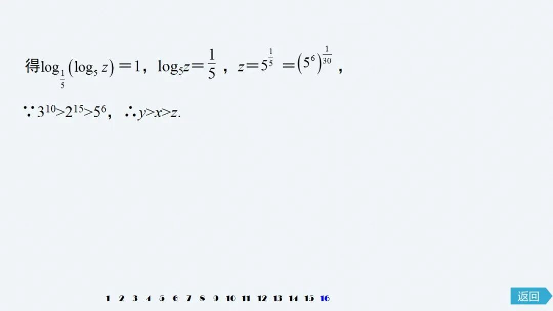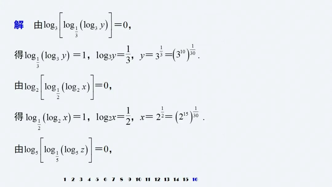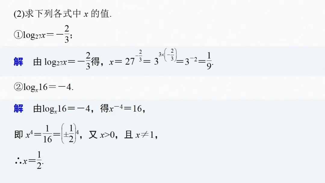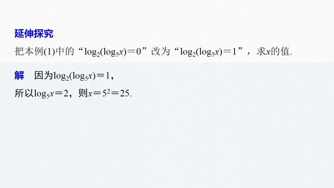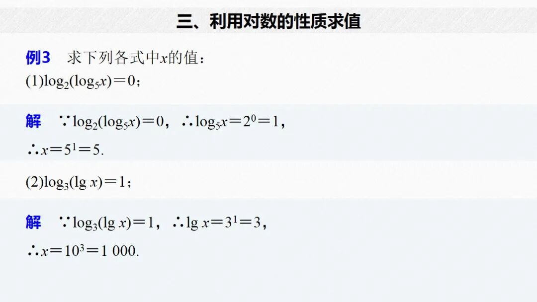 (2)已知多重对数式的值,求变量值,应从外到内求,逐步脱去“log ”后再求解.