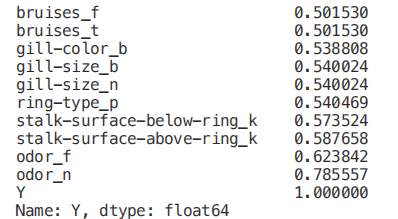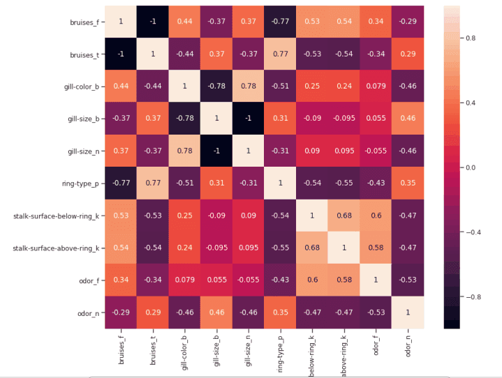 corr2 = Numeric_df[[‘bruises_f’ , ‘bruises_t’ , ‘gill-color_b’ , ‘gill-size_b’ , ‘gill-size_n’ , ‘ring-type_p’ , ‘stalk-surface-below-ring_k’ , ‘stalk-surface-above-ring_k’ , ‘odor_f’, ‘odor_n’]].corr()
