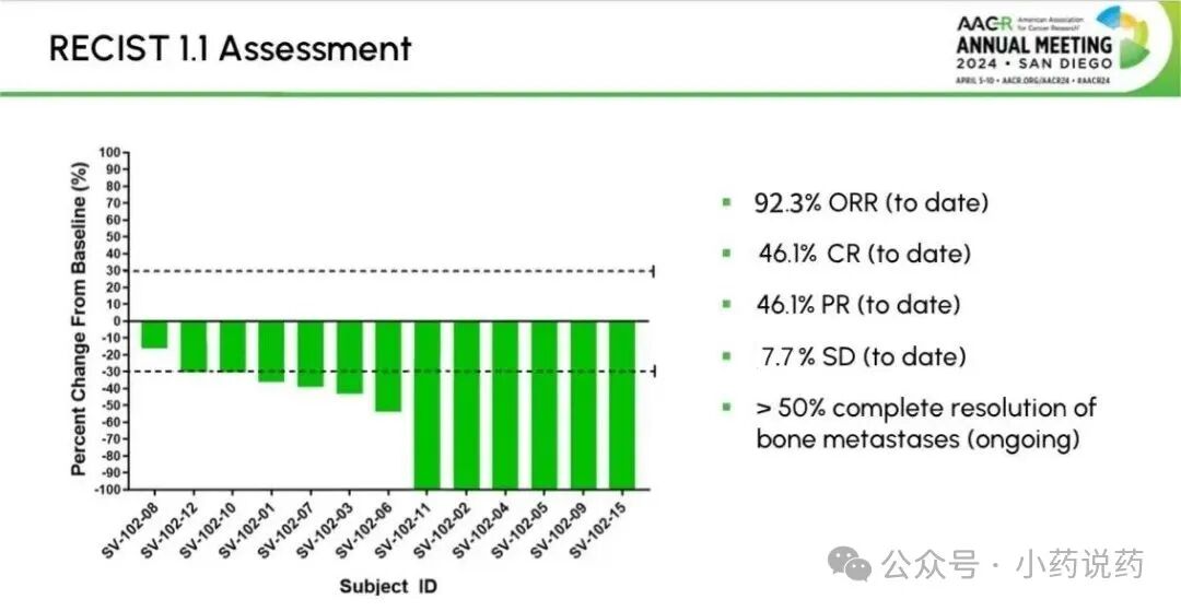 SV-102在转移性去势耐受性前列腺癌患者中表现出卓越的临床反应,在13名可评估的患者中,12人出现了客观响应,其中6人为完全响应(CR),6人部分响应(PR),总响应率(ORR)达92.3%。在数据分析时,另外两名可评估的患者病情稳定。6名患者出现轻度至中度治疗相关不良事件,包括发烧、僵硬、疲劳、发汗、血尿、尿路感染、急性尿潴留和肝酶升高。