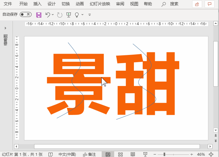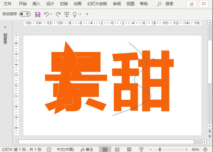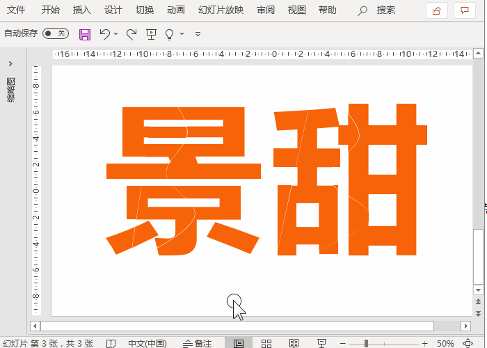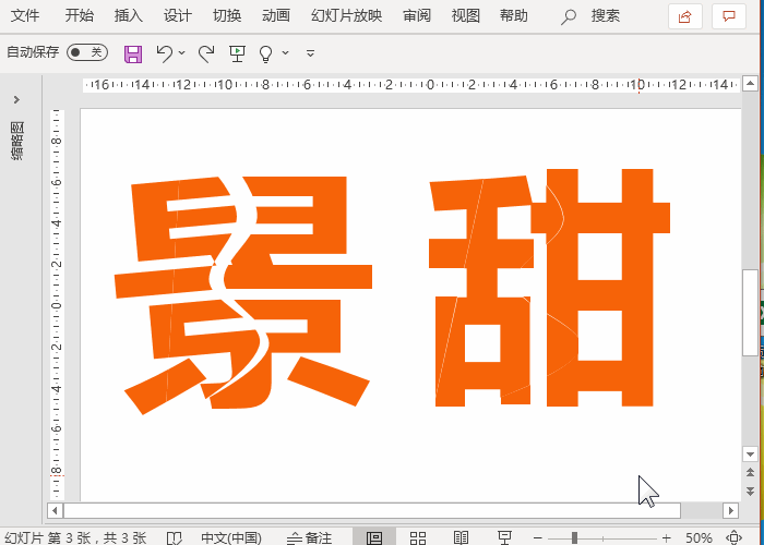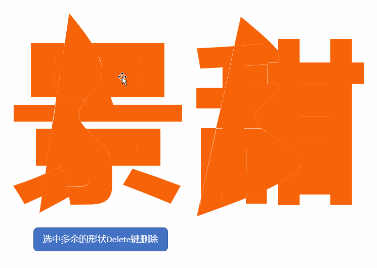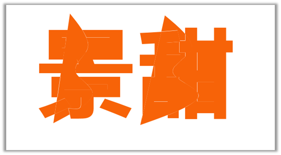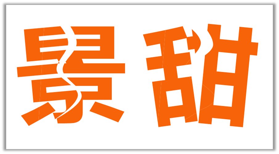 两个字体均按照上述演示的方法进行操作,因为操作步骤相同,“甜”字删除多余形状的步骤就省略了,所有多余的形状元素删除完后,接着使用鼠标框选区域,选择拆分后的字体形状进行组合旋转角度。以“景”字为例,鼠标框选字体一半的区域,按快捷键Ctrl+G进行组合,然后旋转组合好的形状,将字体左右两边分离开,让人看上去有撕裂的效果。