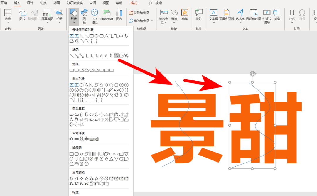 文字输入好后,调大字号,选择微软雅黑字体并将字体加粗显示。在插入形状里面找到曲线,在字体上方进行绘制需要撕裂的效果路径。