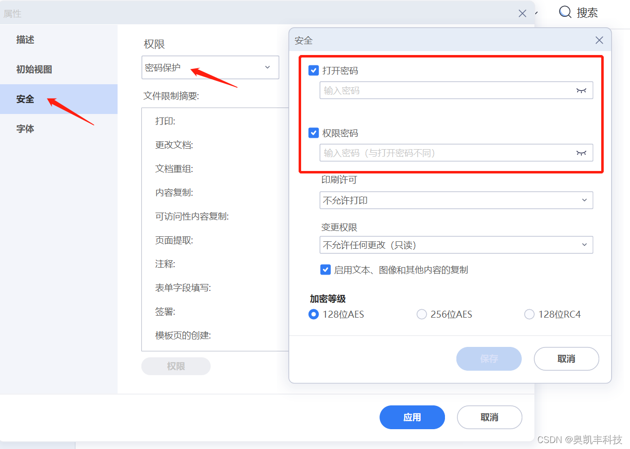 还有就是加密的PDF文件,想要解密,在PDF编辑器中,找到【文件】-【属性】-【安全】在这里我们可以看到打开密码和限制编辑,我们之需要删除密码即可完成解密