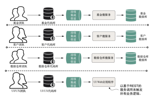 相对于单体架构,它可以让每个团队拥有自己的服务器代码和服务基础设施。这种图示一目了然,读者能够很清晰地看到他们是彼此独立地在构建、部署和测试。