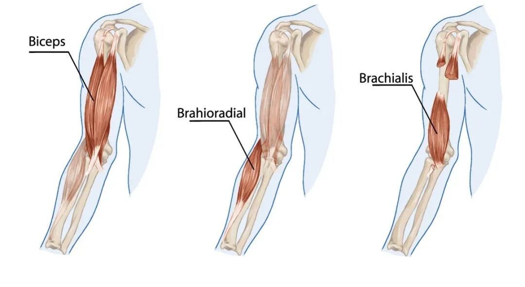 11)屈肘的主要肌肉:肱二头肌(Biceps brachii), 肱肌(Brachialis), 肱桡肌(Brachioradialis)