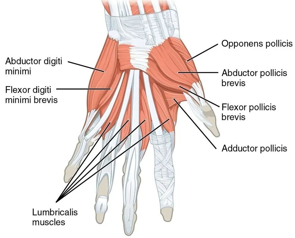 14)手部肌肉从外到内分别为:拇短展肌(Abductor pollicis brevis), 拇短屈肌(Flexor pollicis brevis),拇对向肌(Opponens pollicis), 拇内收肌(Adductor pollicis), 小指对向肌(Opponens digitorum minimis), 小指屈肌(Flexor digitorum minimis), 小指外展肌(Abductor digitorum minimis)。