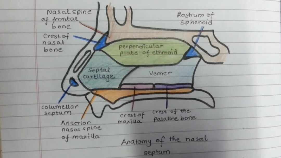 13)鼻中隔骨骼组成:上颌骨(Maxilla), 梨骨(Vomer), 前额骨(Frontal bone), 鼻骨(Nasal bone), 蝶骨(Sphenoid), 筛骨(Ethmoid),腭骨(Palatine) 。