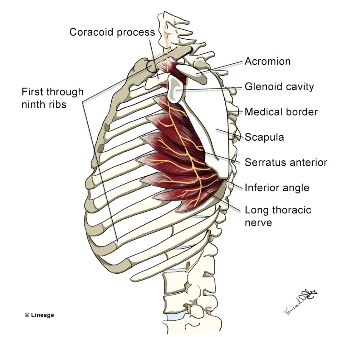 6)支配前锯肌的胸长神经其神经根来源为C5,6,7。前锯肌的主要作用是前伸(Protract)肩胛骨,类似于超人的经典动作。