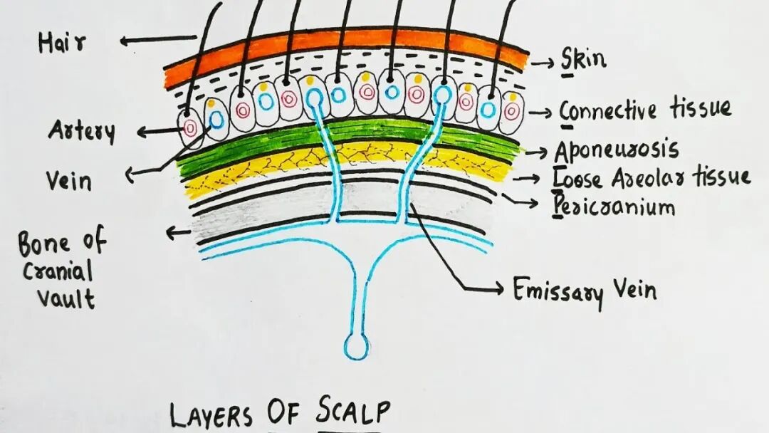 3) 头皮(scalp)分层:皮肤(Skin), 结缔组织(Connective tissue), 腱膜(Aponeurosis), 疏松结缔组织(Loose connective tissue), 骨膜(Periosteum)
