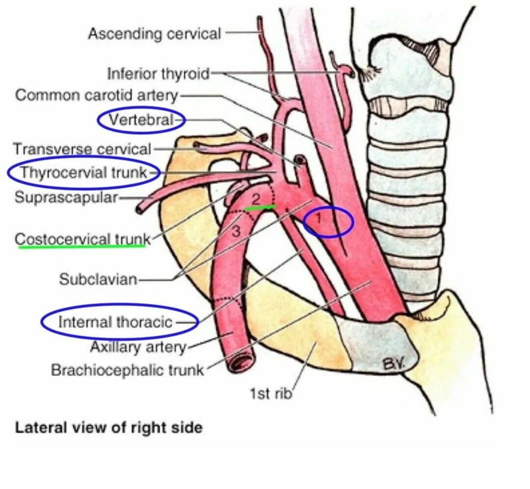19)锁骨下动脉分支:椎胸内动脉(Vertebral Internal thoracic), 甲状颈干(Thyrocervical trunk), 肋颈干(Costocervical trunk), 肩胛背支(Dorsal scapular)。