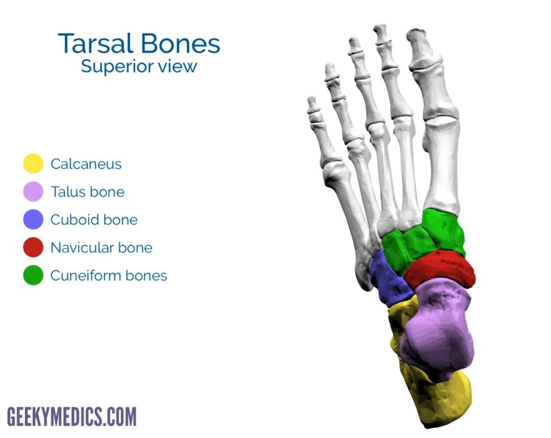 5)跗骨组成(以右足为例,从上方往下然后顺时针转),距骨(Talus)跟骨(Calcaneus) 舟骨(Navicular)内侧/中间/外侧锲状骨(Medial/Intermed/Lateral cuneiform), 骰骨(Cuboid) ,