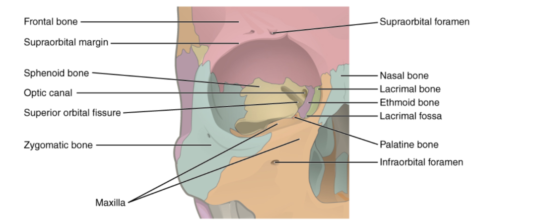 10)眼眶内侧壁的骨骼组成:上颌骨Maxilla (frontal process),泪骨(Lacrimal), 筛骨(Ethmoid), 蝶骨(Sphenoid)