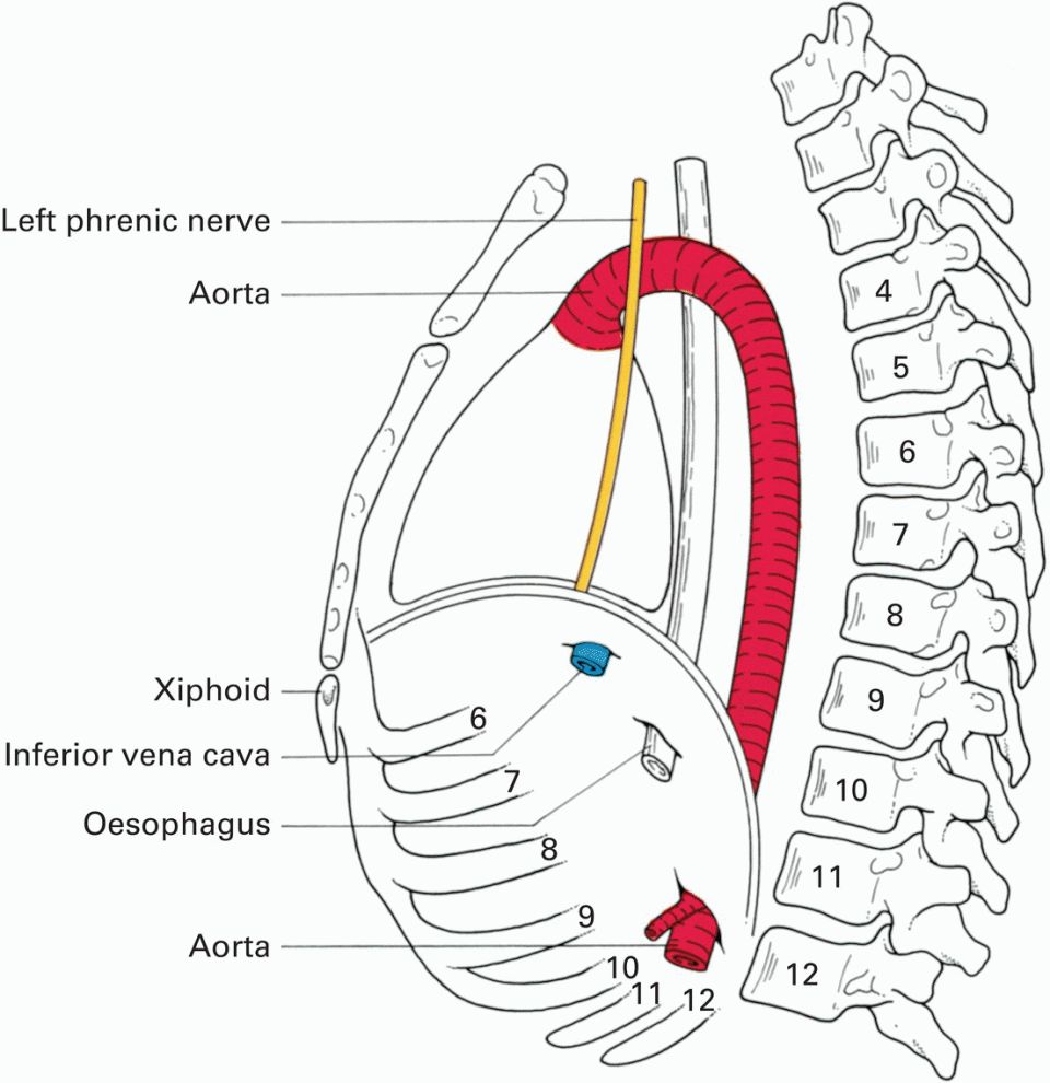 o 下腔静脉腔隙开口(Inferior Vena cava, IVC - T8):对应第8胸椎