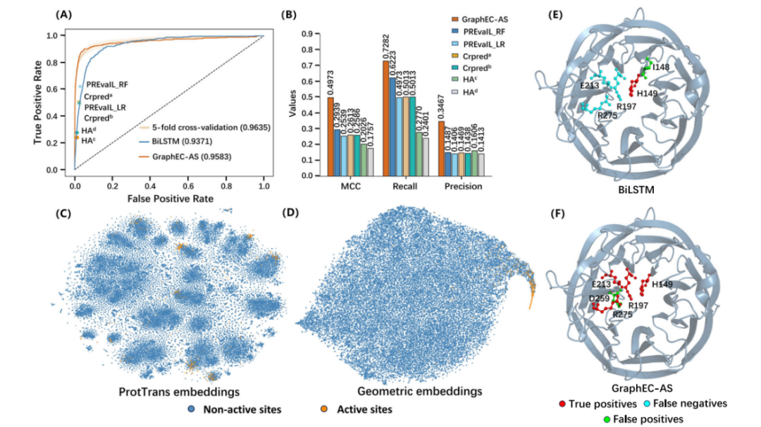 GraphEC-AS通过几何图学习生成的嵌入能够清晰区分活性位点和非活性位点,而ProtTrans嵌入则较为分散。ESMFold预测结构的高质量进一步验证了高质量预测结构的重要性。在三维结构预测中,GraphEC-AS成功识别了所有活性位点,而BiLSTM仅检测到一个,突显了GraphEC-AS在捕捉局部结构信息方面的优势。