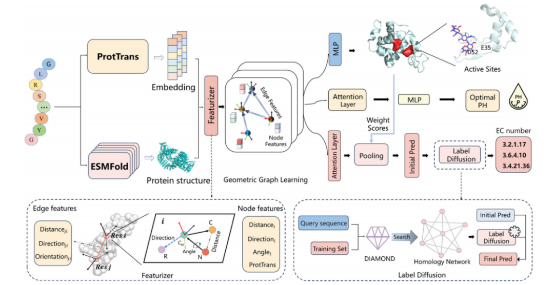 GraphEC是一种基于几何图学习的准确EC编号预测器(图1),整合酶活性位点和预测的蛋白质结构进行功能预测。给定蛋白质序列,ESMFold预测其结构并构建蛋白质图,提取几何特征并通过预训练语言模型(ProtTrans)增强。这些特征输入几何图学习网络进行几何嵌入学习,用于预测活性位点、EC编号和最适pH值。