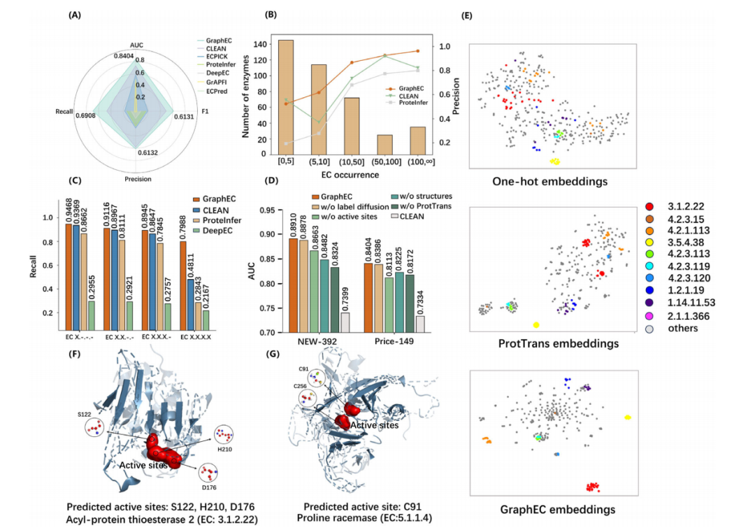 GraphEC在酶EC编号预测中表现卓越(图3),其AUC、召回率、精确度和F1等指标均显著优于四种最先进的EC编号预测器。GraphEC在不同频率和级别的EC编号上均展现出更高的精确度和召回率,尤其是在低频和高级别EC编号上表现尤为突出。此外,活性位点突变实验表明,突变后真实EC编号的预测分数下降,进一步验证了活性位点在EC编号预测中的重要性。GraphEC的推理速度也显著快于CLEAN等方法,结合ESMFold的结构计算时间,满足高通量分析的需求。