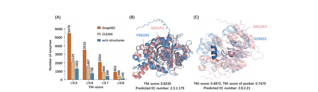 GraphEC在发现新酶功能方面表现出色(图5),通过对Swiss-Prot数据库中未注释EC编号的蛋白质进行注释,发现其预测的EC编号与训练集中共享相同EC编号的蛋白质具有更高的TM分数,显著优于CLEAN。GraphEC在不同TM分数阈值下发现的酶数量均大幅超过CLEAN,展示了其从结构相似性高的酶中学习功能信息的能力。即使TM分数较低,酶活性位点周围的酶口袋仍能对齐,进一步验证了GraphEC从酶结构中学习关键功能信息的能力。此外,GraphE C还能识别无序蛋白质的功能,表明其在功能预测方面的广泛应用潜力。