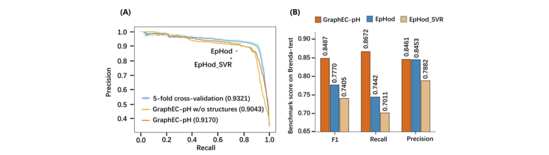 GraphEC-pH在酶最适pH值预测中表现出色(图4),其在Brenda数据库整理的新数据集上的五折交叉验证和独立测试集中显示出高度的稳健性。移除结构信息后,而GraphEC-pH在F1、召回率和精确度等指标上显著优于最新的EpHod和EpHod_SVR方法。此外,GraphEC-pH在区分同源酶对的差异方面也表现优异。这些结果充分展示了GraphEC-pH在酶最适pH值预测中的优越性能。