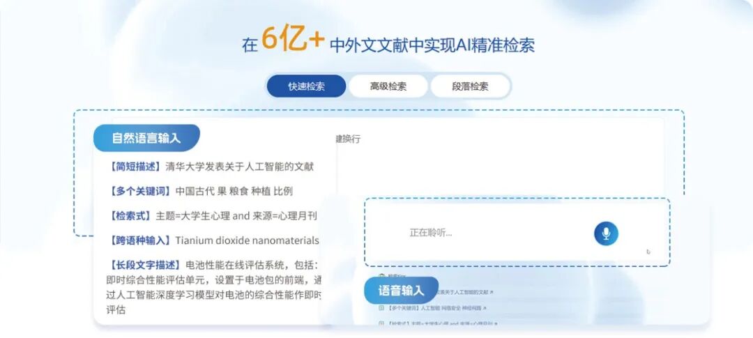 无需掌握复杂的检索表达式,就能轻松获得所需要的主题文献和原文段落;自然语言、语音输入、高级检索任由选择。