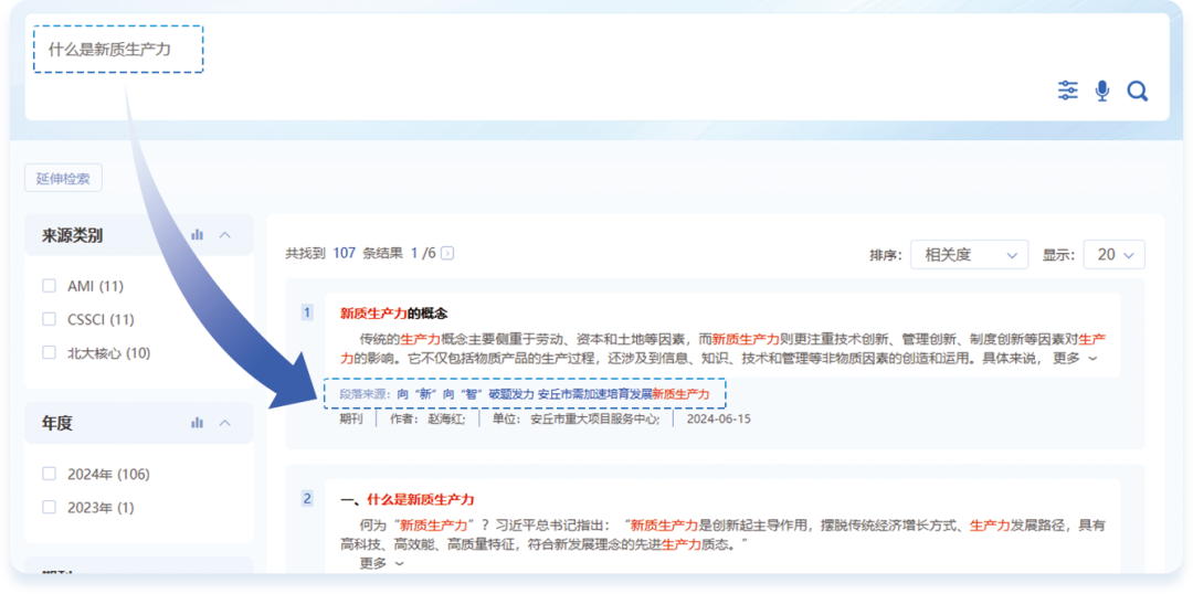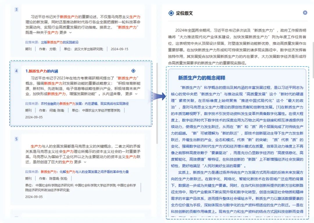 一键追溯原文出处,精准定位原文片段,同主题段落多篇串读,显著提高文献调研的效率。