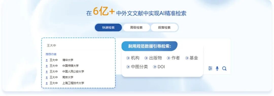 几十年深耕积累的规范化机构库和学者库,能精准匹配目标机构和作者,提供高效的检索发现。