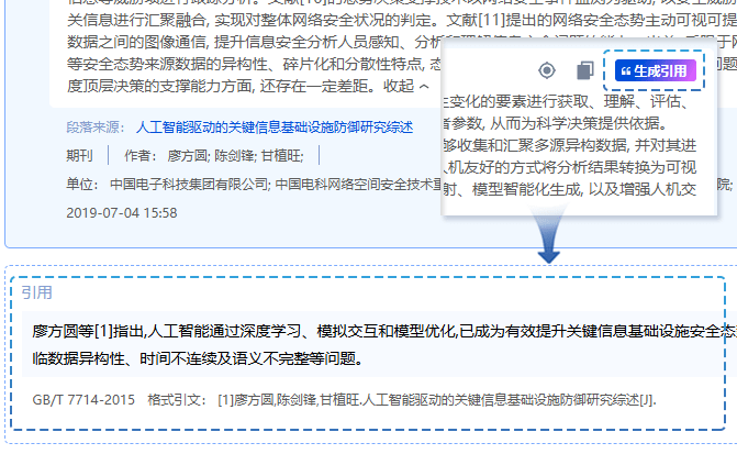 直接检索原文段落,并呈现相关的正文内容。支持一键“定位原文”、一键“生成引用”等功能。