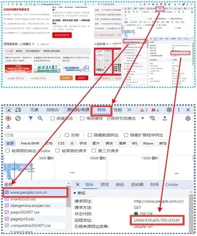 通过浏览器打开IPv6网站,可以在通过浏览器查看远程地址是IPv6地址(检验方式:打开浏览器访问网页,之后按F12,再按F5刷新页面,随便定位到其中一个目录文件,查看【网络】中【标头】属性中的【远程地址】);网页截图如下: