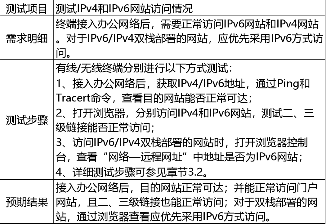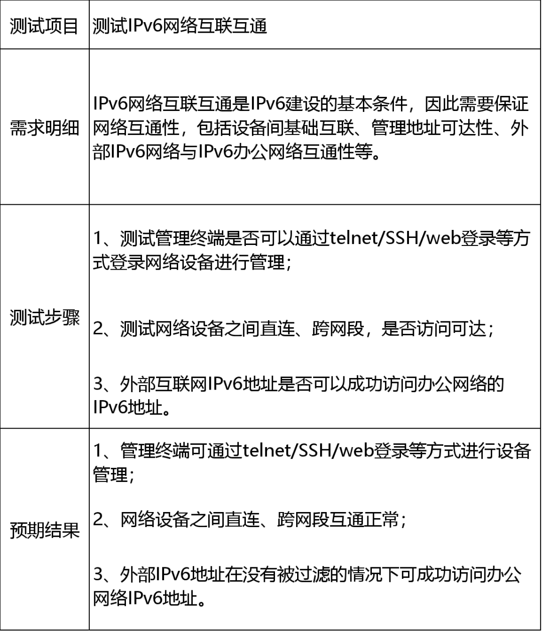 在互联网办公网络出口,使用笔记本电脑直接连接运营商提供的接口链路,并在网卡上配置运营商分配的接口IPv6地址或通过拨号获取IPv6地址,然后ping运营商提供的IPv6网关地址,并访问支持IPv6协议网站(如test-IPv6.com、ipw.cn)。若能正常访问,说明运营商提供的IPv6接口链路和地址资源正常。