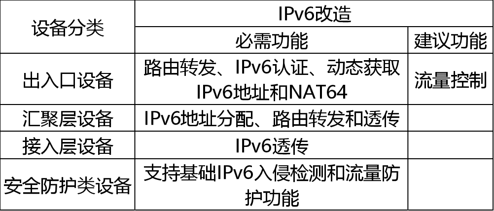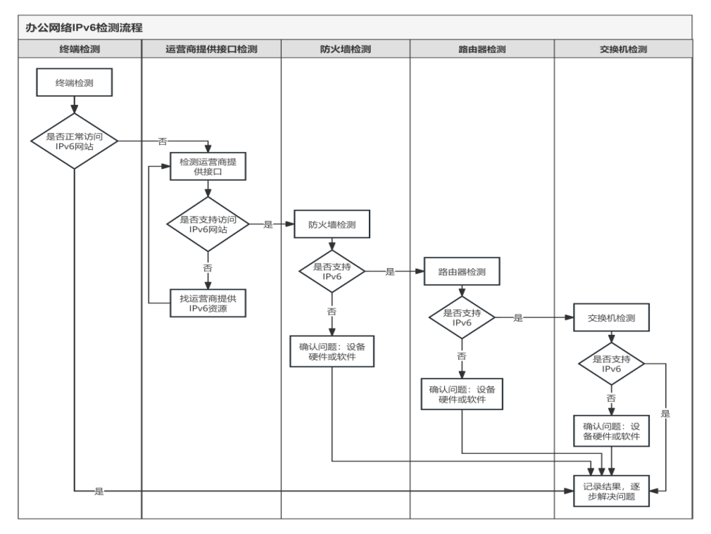 办公网络进行IPv6升级改造前,应先检测办公网络是否支持IPv6。针对不同层级设备,需具备相应的IPv6功能: