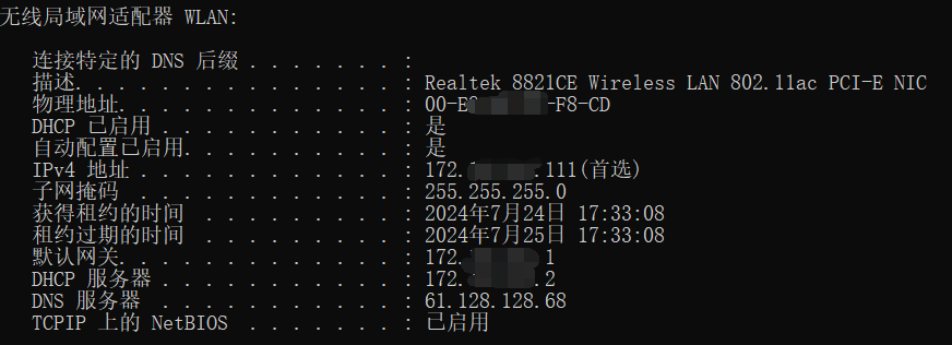 运行ipconfig /all命令,固定终端仅能获取IPv4地址、网关和DNS服务器。运行截图如下: