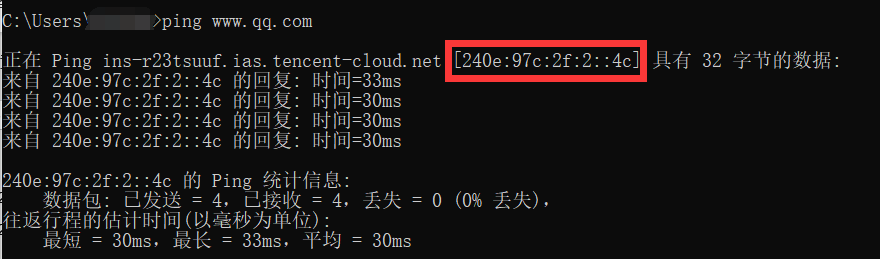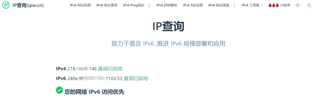 (2)通过运行ipconfig /all命令或Ping命令,查看是否已获取公网IPv6地址,或访问支持IPv6协议网站(如test-IPv6.com、ipw.cn)进行检测。