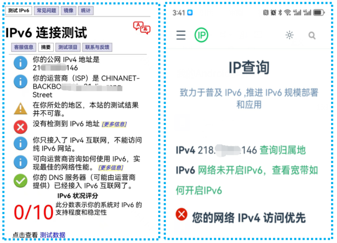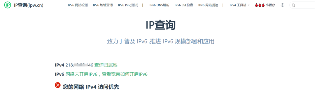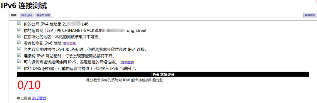 访问test-IPv6.com,IPv6连接测试不通过;访问ipw.cn,显示采用IPv4访问。检测截图如下: