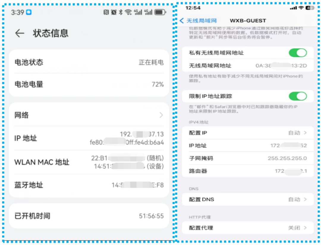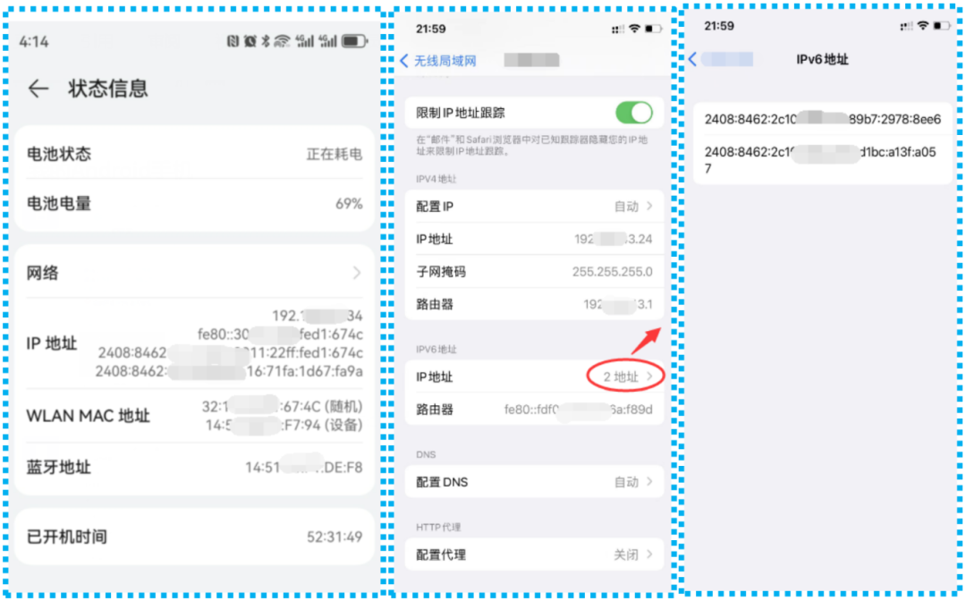 移动终端正常获取公网IPv6地址。安卓/鸿蒙终端及IOS终端截图如下:
