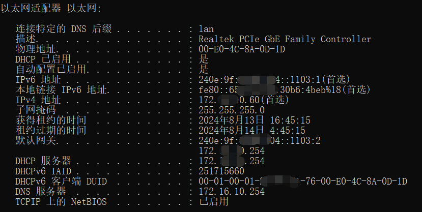 运行ipconfig /all命令,查看固定终端已获取公网IPv6地址、网关和DNS服务器。运行截图如下: