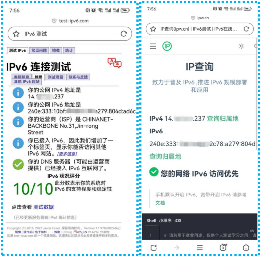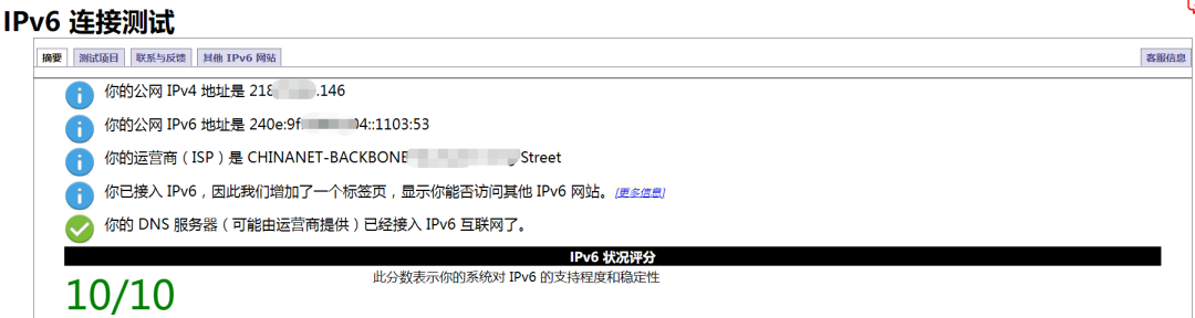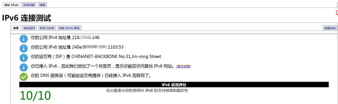 访问test-IPv6.com,IPv6连接测试均通过;访问ipw.cn,显示IPv6状态正常。检测截图如下: