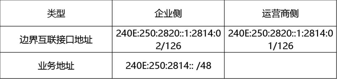 运营商分配给企业分配的IPv6业务地址段为240E:250:2814::/48,实际使用时需要进一步将该整个大段划分成各个小段的地址分配给企业内的有线、无线终端用户,以及一些其他的IPv6业务终端。