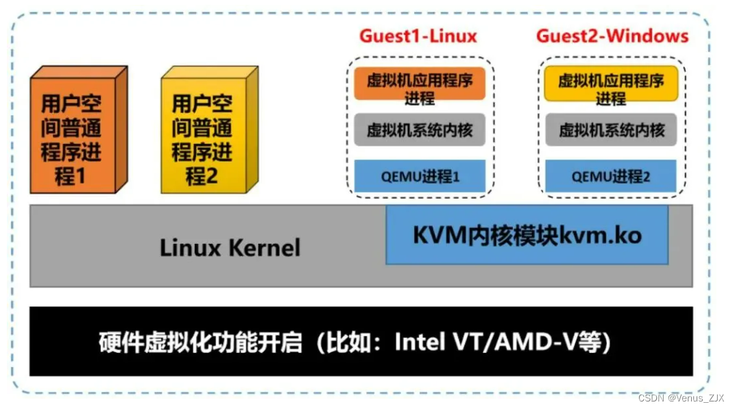 KVM全称Kernel-based Virtual Machine(基于内核的虚拟机),Kvm作为一个模块内建于Linux内核中,依托于Linux社区内核,虚拟机内存和CPU调度等完全由Host kernel实现。广义的KVM就是指KVM虚拟化技术,狭义的KVM多数是指底层kvm模块,内核kvm模块区分CPU类型,Intel和Amd,具体为kvm-intel.ko,kvm-amd.ko,kvm.ko。在KVM中,每一个虚拟机都是由Linux调度程序管理的标准进程。但是KVM虚拟化的实现需要硬件支持(比如Intel的VT技术和AMD的V技术),是基于硬件的虚拟化。