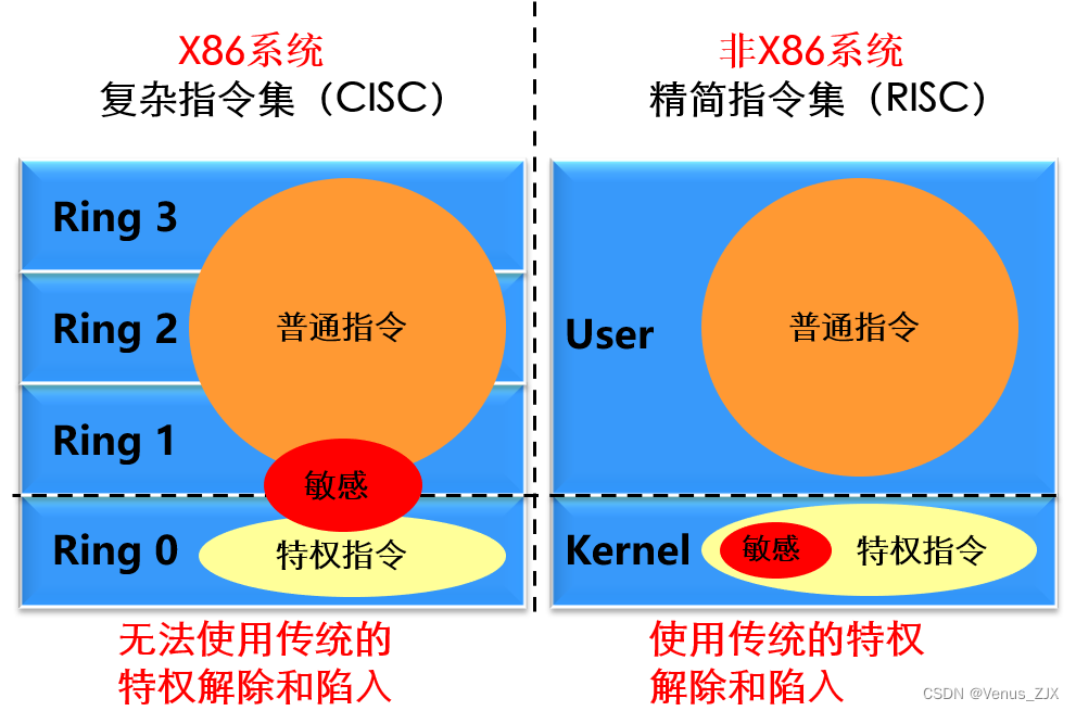 早期的X86架构并不适合于虚拟化,X86架构存在17条敏感的非特权指令,这些指令在虚拟化环境中执行时可能会导致系统异常。(这里会比较迷糊,给大家梳理下指令之间的关系就会豁然开朗啦:①特权指令是操作和管理系统资源的指令,一般由OS发出运行在权限最高的Ring0上 ②敏感指令是指操作特权资源的指令,如读取敏感的寄存器或内存、访问所有I/O指令等等 ③所有特权指令都是敏感指令,但并不是所有敏感指令都是特权命令)
