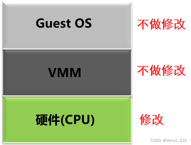 优点:由于虚拟化硬件可提供全新的架构,支持操作系统直接在上面运行,无需进行二进制转换,减少了相关的性能开销,极大简化了 VMM 设计,进而使 VMM 能够按通用标准进行编写,性能更加强大。