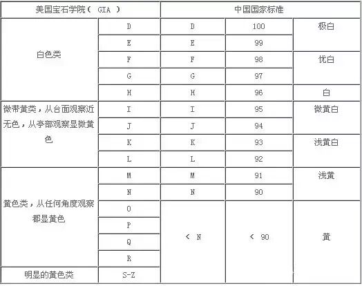 尽管不同的国家和地区对钻石颜色的级别有着不同的表示方法,但总的来说,颜色级别的划分大体上是一致的。目前,世界上对钻石的颜色分级主要遵循两套体系:一套是几乎全球(包括世界上最大的钻石垄断组织-Debees公司)均采用的美国宝石学院(GIA)制定的以英文字母表示的分级体系;另一套是中国香港、台湾等地区所采用的以”百分制”表示的分级体系。我国《钻石分级标准》明确规定了颜色级别采用英文字母表示法,参照国际通用的划分方法,结合我国的实际情况,将颜色分为十二个级别,并以英文字母D-N和<N来依次代表由白到黄的每一个颜色级别。