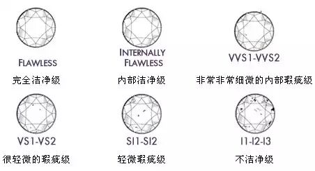 钻石的净度指钻石内外缺陷的程度,包括包裹体、解理、裂隙、双晶、生长纹和蚀象等内部和外部瑕疵。