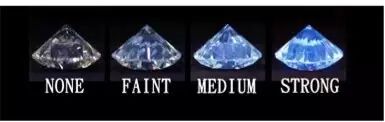 荧光(fluorescence)强度级别划分为“强”、“中”、“弱”、“无”四个等级。荧光级分别为中或强级,可以使接近无色的钻石表面在一定的距离上看起来更加白,从而给钻石增加了一层朦胧之感或者油滑之感。具有中级或强级荧光的钻石价位要比其他钻石价格低。