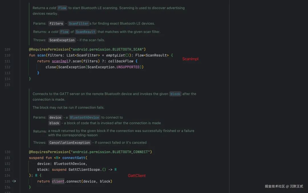 Log.d(“MainActivity”, “scan result: \(it</span> <span style="color: #e06c75;line-height: 26px;">\){it.device.name} \({it.rssi}</span>"</span>)<br /> }<br /></code></pre></section><p style="margin: 0px 8px;line-height: 1.75em;"><span style="color: rgb(37, 41, 51);font-family: -apple-system, system-ui, "Segoe UI", Roboto, Ubuntu, Cantarell, "Noto Sans", sans-serif, BlinkMacSystemFont, "Helvetica Neue", "PingFang SC", "Hiragino Sans GB", "Microsoft YaHei", Arial;text-align: start;background-color: rgb(255, 255, 255);font-size: 15px;letter-spacing: 1px;"></span></p><p style="margin: 0px 8px;line-height: 1.75em;"><span style="font-size: 15px;letter-spacing: 1px;">可以看出通过调用 bluetoothLe.scan 返回了一个Kotlin协程的 Flow<ScanResult> 对象。</span></p><p style="margin: 0px 8px;line-height: 1.75em;"><span style="font-size: 15px;letter-spacing: 1px;"><br /></span></p><p style="margin: 0px 8px;line-height: 1.75em;"><span style="font-size: 15px;letter-spacing: 1px;">和之前的 BLE API 一样,支持对设备扫描的条件进行配置,可以配置 serviceId,deviceName,MAC 地址等信息。</span></p><p style="margin: 0px 8px;line-height: 1.75em;"><span style="font-size: 15px;letter-spacing: 1px;"><br /></span></p><p style="margin: 0px 8px;line-height: 1.75em;text-align: center;"><img src="https://mmbiz.qpic.cn/mmbiz_jpg/v1LbPPWiaSt6HtPDFSEl74soytboDqocxgcUYoAgp2LVLJ7j31cpnU3HnEqyrn7RWAGN8Z6MzibpeeZOV1BQGPUA/640?wx_fmt=other&from=appmsg" class="rich_pages wxw-img" data-backh="521" data-backw="578" data-imgfileid="" data-ratio="0.86259" data-src="https://mmbiz.qpic.cn/mmbiz_jpg/v1LbPPWiaSt6HtPDFSEl74soytboDqocxgcUYoAgp2LVLJ7j31cpnU3HnEqyrn7RWAGN8Z6MzibpeeZOV1BQGPUA/640?wx_fmt=other&from=appmsg" data-type="other" data-w="1048" style="width: 100%;height: auto;"></p><p style="margin: 0px 8px;line-height: 1.75em;"><span style="font-size: 15px;letter-spacing: 1px;"><br /></span></p><p style="margin: 0px 8px;line-height: 1.75em;"><span style="font-size: 15px;letter-spacing: 1px;">然后通过扫描的 ScanResult 结果可以拿到设备信息,如支持的服务 serviceUuids,信号强度 rssi 等信息。</span></p><p style="margin: 0px 8px;line-height: 1.75em;"><span style="font-size: 15px;letter-spacing: 1px;"><br /></span></p><p style="margin: 0px 8px;line-height: 1.75em;text-align: center;"><img src="https://mmbiz.qpic.cn/mmbiz_jpg/v1LbPPWiaSt6HtPDFSEl74soytboDqocxZXoyjcdwicw6MXR0sJe1YJxHLYpibqnwEEepnomHumEYojSMOsqfEyaQ/640?wx_fmt=other&from=appmsg" class="rich_pages wxw-img" data-backh="538" data-backw="578" data-imgfileid="" data-ratio="0.36641" data-src="https://mmbiz.qpic.cn/mmbiz_jpg/v1LbPPWiaSt6HtPDFSEl74soytboDqocxZXoyjcdwicw6MXR0sJe1YJxHLYpibqnwEEepnomHumEYojSMOsqfEyaQ/640?wx_fmt=other&from=appmsg" data-type="other" data-w="1048" style="width: 100%;height: auto;"></p><p style="margin: 0px 8px;line-height: 1.75em;"><span style="font-size: 15px;letter-spacing: 1px;"><br /></span></p><p style="margin: 0px 8px;line-height: 1.75em;"><span style="font-size: 15px;letter-spacing: 1px;">扫描到结果后,不需要我们手动去关闭扫描。会自动关闭扫描。</span></p><p style="margin: 0px 8px;line-height: 1.75em;"><span style="font-size: 15px;letter-spacing: 1px;"><br /></span></p><p style="margin: 0px 8px;line-height: 1.75em;text-align: center;"><img src="https://mmbiz.qpic.cn/mmbiz_jpg/v1LbPPWiaSt6HtPDFSEl74soytboDqocxnJPVibMrFfWpibviaumjjCuYBjYL3eMcJdwubH4xt06wDACOsOOQ7kWxg/640?wx_fmt=other&from=appmsg" class="rich_pages wxw-img" data-backh="290" data-backw="578" data-imgfileid="" data-ratio="0.18519" data-src="https://mmbiz.qpic.cn/mmbiz_jpg/v1LbPPWiaSt6HtPDFSEl74soytboDqocxnJPVibMrFfWpibviaumjjCuYBjYL3eMcJdwubH4xt06wDACOsOOQ7kWxg/640?wx_fmt=other&from=appmsg" data-type="other" data-w="1080" style="width: 100%;height: auto;"></p><p style="margin: 0px 8px;line-height: 1.75em;"><span style="font-size: 15px;letter-spacing: 1px;"><br /></span></p><p style="margin: 0px 8px;line-height: 1.75em;"><span style="font-size: 15px;letter-spacing: 1px;">可以看出新出的这个蓝牙库,比之前的扫描操作代码少了很多,也简洁了很多。</span></p><p style="margin: 0px 8px;line-height: 1.75em;"><br /></p><p style="margin: 0px 8px;text-align: center;line-height: 1.75em;"><span style="color: rgb(140, 178, 90);font-family: -apple-system-font, system-ui, "Helvetica Neue", "PingFang SC", "Hiragino Sans GB", "Microsoft YaHei UI", "Microsoft YaHei", Arial, sans-serif;background-color: rgb(255, 255, 255);letter-spacing: 1px;">/ 连接 /</span></p><p style="margin: 0px 8px;line-height: 1.75em;"><br /></p><p style="margin: 0px 8px;line-height: 1.75em;"><span style="color: rgb(37, 41, 51);font-family: -apple-system, system-ui, "Segoe UI", Roboto, Ubuntu, Cantarell, "Noto Sans", sans-serif, BlinkMacSystemFont, "Helvetica Neue", "PingFang SC", "Hiragino Sans GB", "Microsoft YaHei", Arial;text-align: start;background-color: rgb(255, 255, 255);font-size: 15px;letter-spacing: 1px;">扫描到设备后,对设备进行发起连接操作。</span></p><p style="margin: 0px 8px;line-height: 1.75em;"><span style="color: rgb(37, 41, 51);font-family: -apple-system, system-ui, "Segoe UI", Roboto, Ubuntu, Cantarell, "Noto Sans", sans-serif, BlinkMacSystemFont, "Helvetica Neue", "PingFang SC", "Hiragino Sans GB", "Microsoft YaHei", Arial;text-align: start;background-color: rgb(255, 255, 255);font-size: 15px;letter-spacing: 1px;"><br /></span></p><section data-tool="mdnice编辑器" data-website="https://www.mdnice.com" style="margin-bottom: 0px;padding-left: 10px;padding-right: 10px;background-attachment: scroll;background-clip: border-box;background-image: none;background-origin: padding-box;background-position: 0% 0%;background-repeat: no-repeat;background-size: auto;width: auto;font-family: Optima, PingFangSC-light, serif;font-size: 16px;color: rgb(0, 0, 0);line-height: 1.5em;word-spacing: 0em;letter-spacing: 0em;word-break: break-word;text-align: left;"><pre data-tool="mdnice编辑