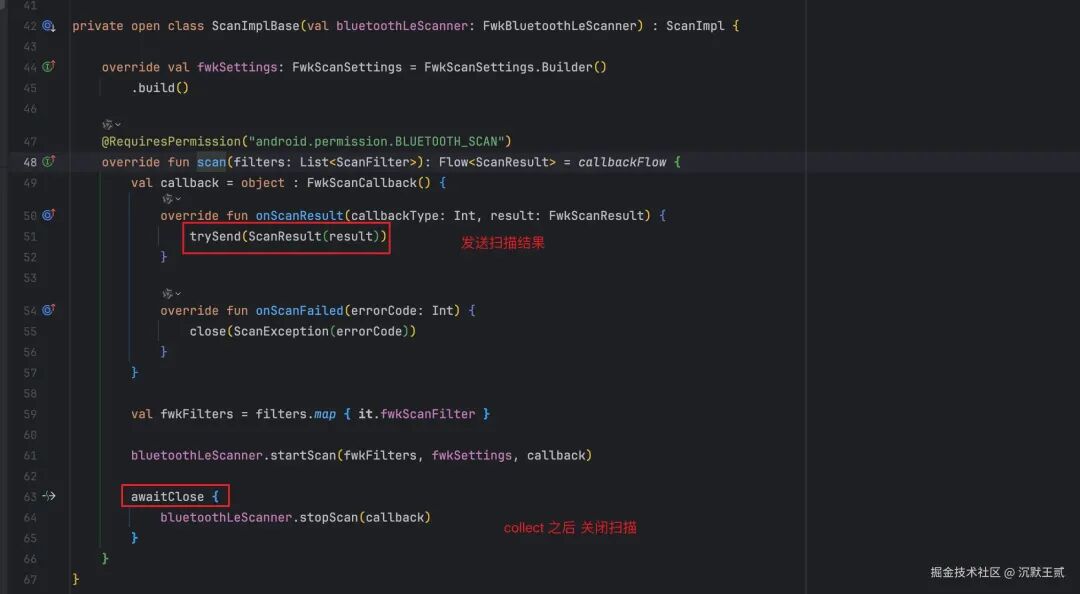 底层还是使用 BluetoothLeScanner 进行扫描操作,将过滤条件放进 BluetoothLeScanner中,扫描到设备后发送数据,collect处理之后关闭扫描。