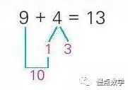 在学生理解了凑十法之后,需要进行必要的基础训练,主要包括两种形式的训练:一是算式形式训练,如9+4=9+1+3=10+3=13;二是图形形式计算,如下图。