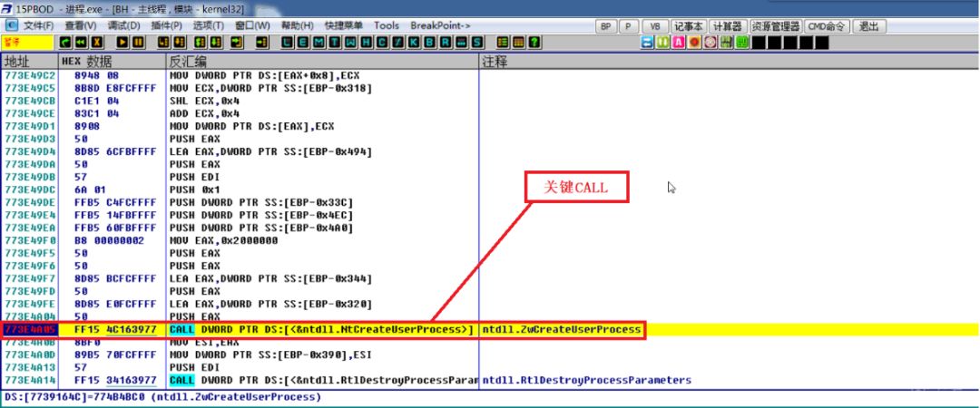 R0环下windbg调式对新手用户并不友好,故而只用它找到CreateUserProcess的函数地址就可,然后在IDA中查看CreateUserProcess 的具体实现。